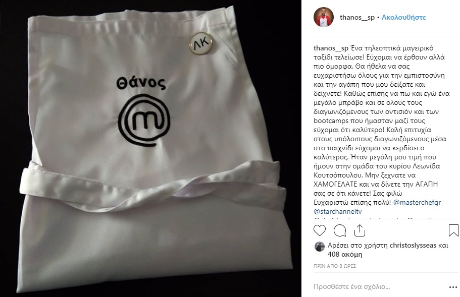 Ο 33χρονος Θάνος Σπανός – ο οποίος είχε προκαλέσει τον θαυμασμό των κριτών με τα δύο υπέροχα γλυκά που είχε φτιάξει κατά τη διάρκεια παραμονής του στο παιχνίδι – λίγες ώρες μετά την αποχώρησή του από το Master Chef έστειλε το πρώτο μήνυμα μέσα από τα μέσα κοινωνικής δικτύωσης: «Ένα τηλεοπτικά μαγειρικό ταξίδι τελείωσε! Εύχομαι να έρθουν αλλά πιο όμορφα. Θα ήθελα να σας ευχαριστήσω όλους για την εμπιστοσύνη και την αγάπη που μου δείξατε και δείχνετε! Καθώς επίσης να πω και εγώ ένα μεγάλο μπράβο και σε όλους τους διαγωνιζόμενους των οντισιόν και των bootcamps που ήμασταν μαζί τους εύχομαι ότι καλύτερο! Καλή επιτυχία στους υπόλοιπους διαγωνιζόμενους μέσα στο παιχνίδι εύχομαι να κερδίσει ο καλύτερος. Ήταν μεγάλη μου τιμή που ήμουν στην ομάδα του κυρίου Λεωνίδα Κουτσόπουλου. Μην ξεχνάτε να ΧΑΜΟΓΕΛΑΤΕ και να δίνετε την ΑΓΑΠΗ σας σε ότι κάνετε! Σας φιλώ. Ευχαριστώ επίσης πολύ!»