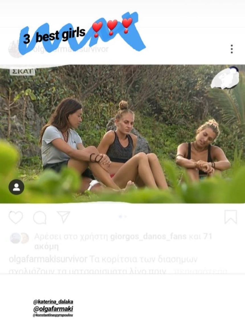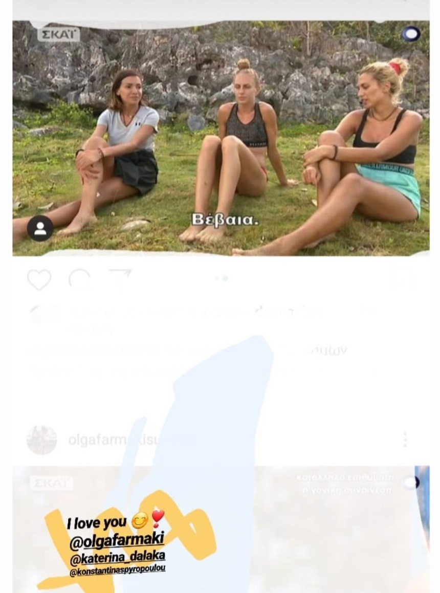 Πρόσφατα, η ίδια μοιράστηκε με τους διαδικτυακούς φίλους της στο Instagram δύο φωτογραφίες κατά τη διάρκεια της παραμονής της μέσα στο παιχνίδι. Όπως θα δεις, τα κορίτσια των διάσημων, Κατερίνα Δαλάκα, Όλγα Φαρμάκη και Κωνσταντίνα Σπυροπούλου βρίσκονται στο νησί της ομάδας τους και απολαμβάνουν ξέγνοιαστες στιγμές πριν από τη μάχη. Έχοντας τα μαλλιά της κότσο και χωρίς ίχνος μακιγιάζ η εικόνα του τότε δεν θυμίζει σε τίποτα την εικόνα του σήμερα.