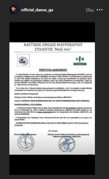 Ο 10χρονος αντιμετωπίζει ένα σοβαρό πρόβλημα υγείας και η οποιαδήποτε οικονομική ενίσχυση είναι πολύτιμη. Γι’ αυτό και ο Ντάνος, ο οποίος μετρά χιλιάδες followers στο Instagram και ότι δημοσιεύει στον προσωπικό του λογαριασμό έχει μεγάλη απήχηση, θέλησε να συμβάλει με τον δικό του τρόπο στην προσπάθεια αυτή.
