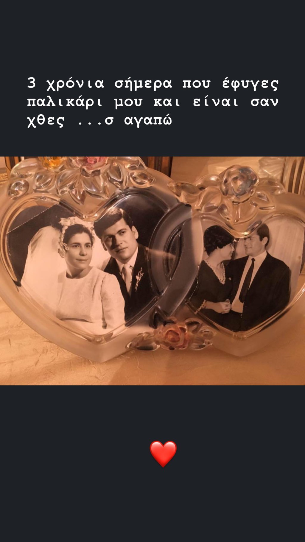 Χθες, με αφορμή την συμπλήρωση τριών χρόνων από εκείνη την ημέρα, ο Γιάννης Σπαλιάρας έκανε μια πολύ συγκινητική ανάρτηση στον προσωπικό του λογαριασμό στο Instagram. Συγκεκριμένα, δημοσίευσε στα InstaStrories του δυο φωτογραφίες των γονιών του από το παρελθόν, γράφοντας χαρακτηριστικά: «Τρία χρόνια σήμερα που έφυγες παλικάρι μου και είναι σαν χθες… σ’ αγαπώ».