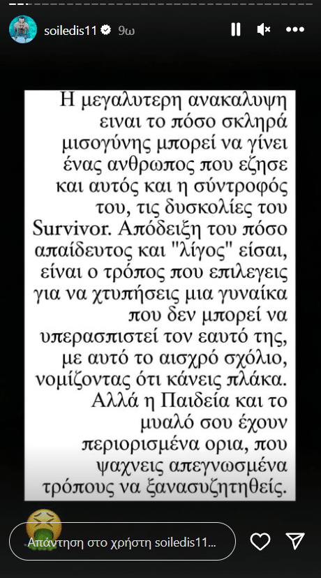 Απόδειξη του πόσο απαίδευτος και “λίγος” είσαι, είναι ο τρόπος που επιλέγεις για να χτυπήσεις μια γυναίκα που δεν μπορεί να υπερασπιστεί τον εαυτό της, με αυτό το αίσχρο σχόλιο, νομίζοντας ότι κάνεις πλάκα.