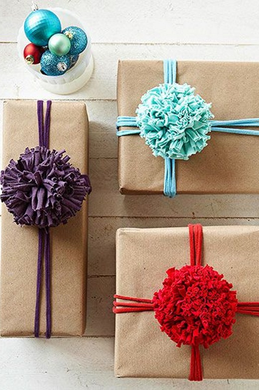 Άλλος ένας DIY, υφασμάτινος τρόπος να διακοσμήσεις τα δώρα σου είναι φτιάχνοντας από βαμβακερά νήματα μεγάλα πομ πον και έπειτα να τα τοποθετήσεις πάνω στα τυλιγμένα κουτιά!