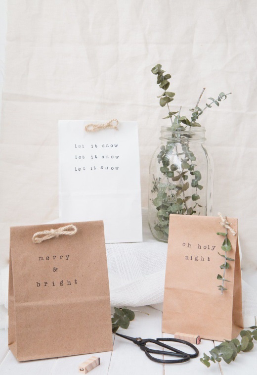 Θέλεις να αποφύγεις τα περίτεχνα τυλίγματα και τις κορδέλες; Τότε εφοδιάσου με χαρτοσακούλες, τοποθέτησε μέσα τα δώρα σου, φτιάξε μικρά φιογκάκια με σπάγκο, κόλλησε με κόλλα σιλικόνης κι ένα μικρό κλαδάκι δενδρολίβανου και είσαι έτοιμη!