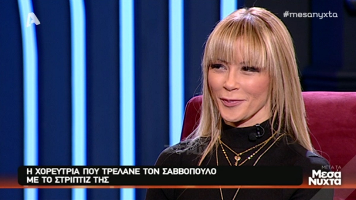 Εξίσου αποκαλυπτική και στις συνεντεύξεις της, η επαγγελματίας χορεύτρια εξήγησε στην Ελεονώρα Μελέτη πώς βρέθηκε στη σκηνή: «Ο Σαββόπουλος με πήρε τηλέφωνο και μου ζήτησε να σκηνοθετήσουμε ένα στριπτίζ στη σκηνή. Πριν ξεκινήσω το στριπτίζ ήμουν ντυμένη αστυνομικός».