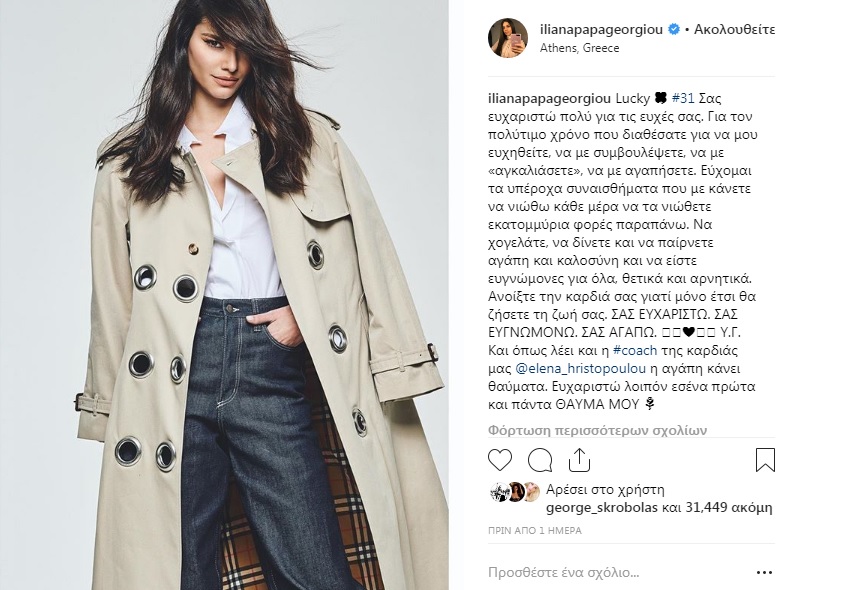 Χαρούμενη και συγκινημένη με την αγάπη του κόσμου, η μελαχρινή καλλονή σε ανάρτησή της έγραψε: “Lucky #31 Σας ευχαριστώ πολύ για τις ευχές σας. Για τον πολύτιμο χρόνο που διαθέσατε για να μου ευχηθείτε, να με συμβουλέψετε, να με «αγκαλιάσετε», να με αγαπήσετε. Εύχομαι τα υπέροχα συναισθήματα που με κάνετε να νιώθω κάθε μέρα να τα νιώθετε εκατομμύρια φορές παραπάνω. Να χαμογελάτε, να δίνετε και να παίρνετε αγάπη και καλοσύνη και να είστε ευγνώμονες για όλα, θετικά και αρνητικά. Ανοίξτε την καρδιά σας γιατί μόνο έτσι θα ζήσετε τη ζωή σας. Σας ευχαριστώ. Σας ευγνωμωνώ. Σας αγαπώ.».