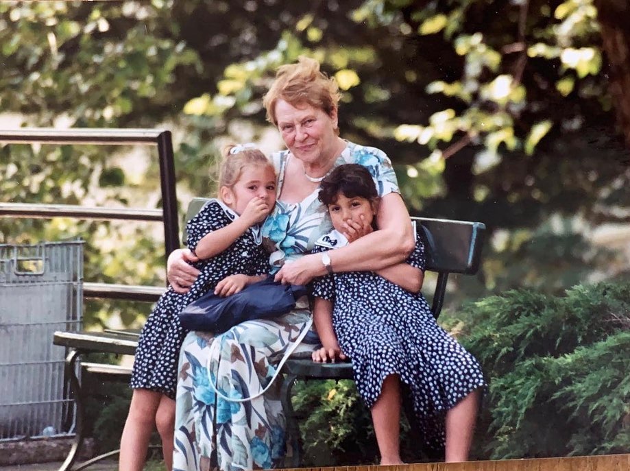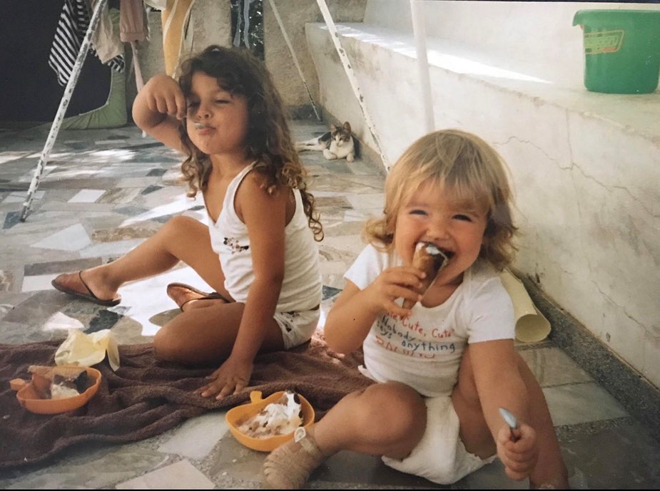 «Σπίτι της Γιαγιάς, ανέμελα παιδικά χρόνια.. τότε που η ευτυχία σήμαινε παγωτό και ο φόβος, μην λερωθούμε πολύ! Αυτά τα μπολάκια.. τι παγωτά, τι μπισκότα.. τούρτες, κομπόστες..βάφλες! Όλα από τα χεράκια της.. Και τώρα στο γηροκομείο στην Γερμανία που βρίσκετε λέει πως μας φτιάχνει μπισκότα και μας περιμένει.. φυσικά αυτό είναι στο μυαλό της από τα φάρμακα.. μπισκότα δεν μπορεί να φτιάξει πιά και δεν ξέρει ότι δεν γίνεται να έρθουμε.. Χαίρομαι όμως που ζεί στον κόσμο της πλέον η γιαγιάκα μου και είναι ευτυχισμένη, γιατί ο δικός μας κόσμος θα την στεναχωρούσε πολύ… #sisters #SummerAtGrandmas», έγραψε χαρακτηριστικά.