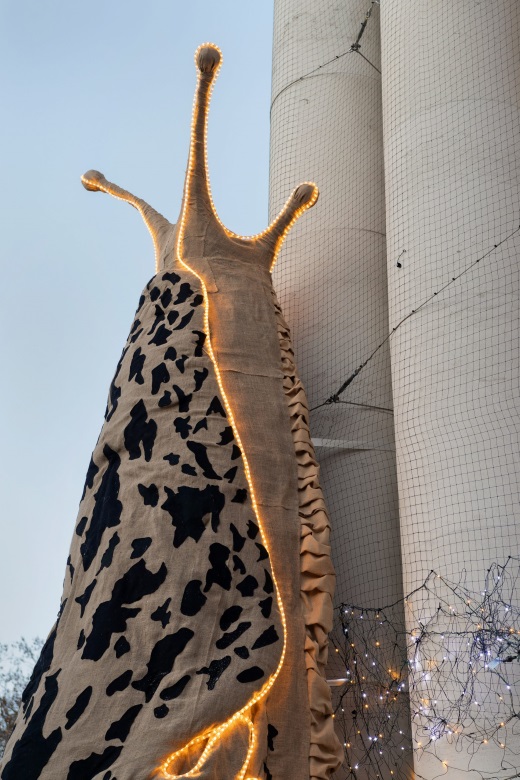 Με στόχο να ξεκινήσει έναν διάλογο γύρω από την βιωσιμότητα του πλανήτη και τις εναλλακτικές πηγές ενέργειας, η καλλιτέχνιδα εμπνεύστηκε από τον τρόπο αναπαραγωγής των γυμνοσαλιάγκων, οι οποίοι ενώνουν τις κεραίες τους και εκπέμπουν μπλε φως. Έτσι και το “γλυπτό” της, που αποτελείται από τους δύο σάλιαγκες μήκους 10 μέτρων με τις φωτεινές κεραίες, αλλά και το glittery σάλιο που αφήνουν πίσω τους. Καθένας είναι φτιαγμένος από βιοδιασπώμενα υλικά, όπως ξύλο, ψάθα, τσόχα και καμβά, τα οποία μετά την τρίμηνη παραμονή τους στην Tate θα ανακυκλωθούν εξολοκλήρου.