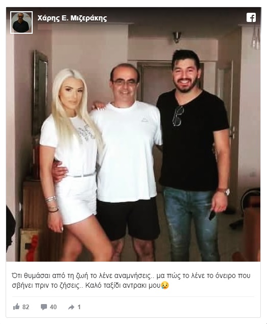 Ένας από αυτούς ήταν και ο πατέρας της Στέλλας Μιζεράκη, ο οποίος του είπε «αντίο» με μία συγκινητική ανάρτηση στον προσωπικό του λογαριασμό στο Facebook. Συγκεκριμένα, δημοσίευσε στον προσωπικό του λογαριασμό μια φωτογραφία, στην οποία ο ίδιος πόζαρε ανάμεσα στην κόρη του και τον άτυχο 28χρονο, σχολιάζοντας στη λεζάντα που την συνόδευε: «Ό,τι θυμάσαι από τη ζωή το λένε αναμνήσεις.. μα πώς το λένε το όνειρο που σβήνει πριν το ζήσεις.. Καλό ταξίδι αντράκι μου».