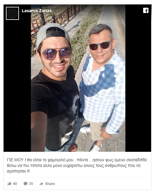 Η μητέρα του άτυχου 28χρονου συγκλόνισε με το μήνυμά της στο Facebook και την δημοσίευση της τελευταίας φωτογραφίας που έβγαλε με τον γιο της, ενώ στη συνέχεια και το δημόσιο «αντίο» του πατέρα του ράγισε καρδιές. Συγκεκριμένα, ο κύριος Λάζαρος Ζάρλας δημοσίευσε μια φωτογραφία με τον Πάνο Ζάρλα, στη λεζάντα της οποίας έγραψε χαρακτηριστικά: «ΓΙΕ ΜΟΥ! Θα είσαι το χαμόγελό μου ..πάντα …ήσουν φως έμεινε σκοτάδι!! Δε θέλω να πω τίποτα άλλο, μόνο ευχαριστώ όλους τους ανθρώπους που σε αγάπησαν!!».