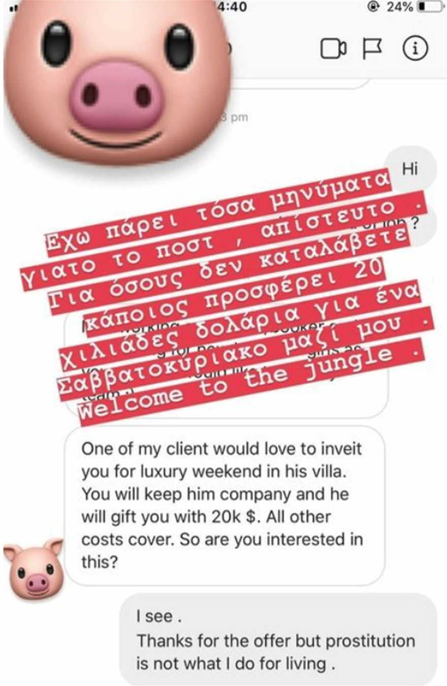Το μήνυμα έγραφε, στα αγγλικά, το εξής: «Εργάζομαι ως booker και ψάχνω για νέα όμορφα κορίτσια, όπως εσείς, θέλετε να συμμετάσχετε στην ομάδα μου; Ένας από τους πελάτες μου θα ήθελε πολύ να σας προσκαλέσει για ένα πολυτελές Σαββατοκύριακο στη βίλα του. Θα του κρατήσετε συντροφιά και θα σας ανταμείψει με 20.000 δολάρια. Όλα τα άλλα έξοδα καλυμμένα! Σας ενδιαφέρει αυτό;».