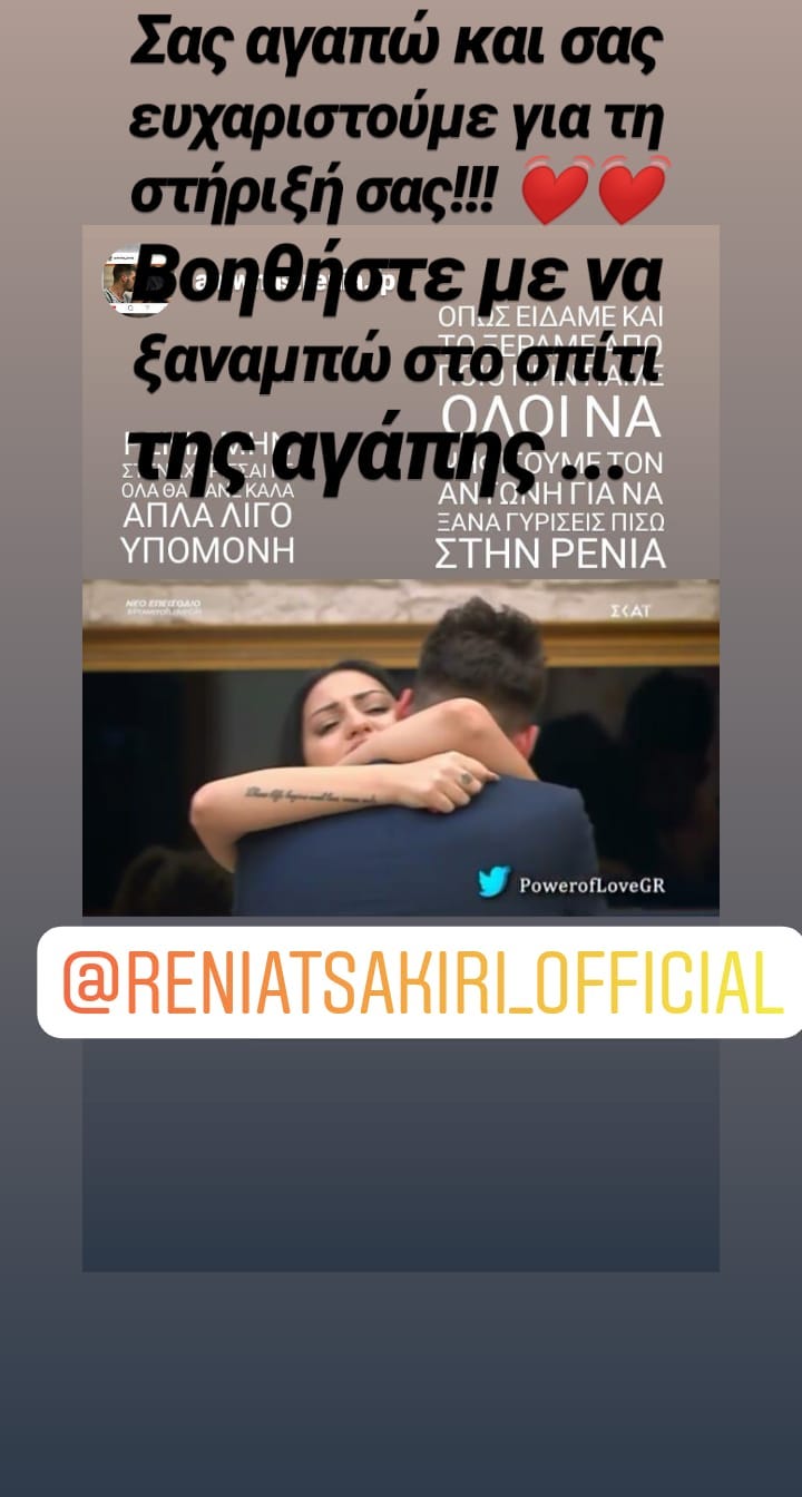 Στην πρώτη του ανάρτηση, λοιπόν, λίγες ώρες μετά την προβολή του επεισοδίου, έγραψε χαρακτηριστικά.»Σας αγαπώ και σας ευχαριστούμε για τη στήριξή σας!!! Βοηθήστε με να ξαναμπώ στο σπίτι της αγάπης». Ο χρόνος θα δείξει τι θα συμβεί τελικά και αν θα καταφέρει ο Αντώνης να επιστρέψει στο παιχνίδι.