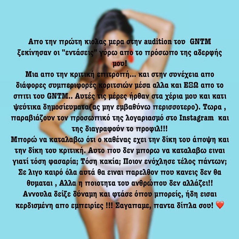 Συγκεκριμένα, δημοσίευσε μια φωτογραφία της 21χρονης καλλονής, γράφοντας χαρακτηριστικά: «Από την πρώτη κιόλας μέρα στην audition του GNTM ξεκίνησαν οι “εντάσεις” γύρω από το πρόσωπο της αδερφής μου! Μια από την κριτική επιτροπή… και στη συνέχεια από διάφορες συμπεριφορές κοριτσιών μέσα αλλά και ΕΞΩ από το σπίτι του GNTM. Αυτές τις μέρες ήρθαν στα χέρια μου και κάτι ψεύτικα δημοσιεύματα (ας μην εμβαθύνω περισσότερο). Τώρα, παραβιάζουν τον προσωπικό της λογαριασμό στο Instagram και της διαγράφουν το προφίλ. Μπορώ να καταλάβω ότι ο καθένας έχει τη δική του άποψη και τη δική του κριτική. Αυτό που δεν μπορώ να καταλάβω είναι γιατί τόση φασαρία; Τόση κακία; Ποιον ενόχλησε τέλος πάντων; Σε λίγο καιρό όλα αυτά θα είναι παρελθόν που κανείς δεν θα θυμάται. Αλλά η ποιότητα του ανθρώπου δεν αλλάζει!! Αννούλα δείξε δύναμη και φτάσε όπου μπορείς, ήδη είσαι κερδισμένη από εμπειρίες!!! Σ’ αγαπάμε, πάντα δίπλα σου».
