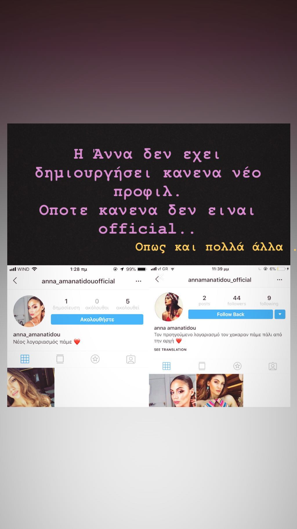 «Για όσους ψάχνουν και δεν βρίσκουν το προφίλ της Άννας!!», έγραψε χαρακτηριστικά στη λεζάντα που την συνόδευε, με τα likes και τα σχόλια από τους followers της να πέφτουν… βροχή. Μάλιστα, σε νεότερη ανάρτησή της, η ίδια ξεκαθάρισε πώς: «Η Άννα δεν έχει δημιουργήσει κανένα νέο προφίλ. Οπότε κανένα δεν είναι official».
