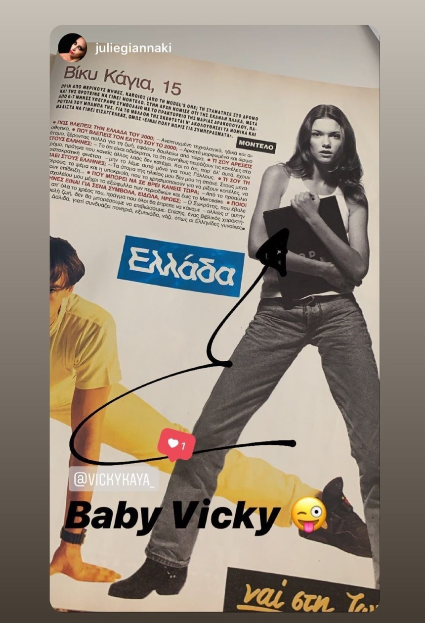 Πριν μερικές ώρες, η Βίκυ Καγιά μοιράστηκε με τους διαδικτυακούς φίλους της στο Instagram μια φωτογραφία από μία σελίδα περιοδικού στην οποία την βλέπουμε να ποζάρει σε ηλικία 15  ετών. Φορώντας τζιν και ένα λευκό top η Βίκυ Καγιά είναι μία πανέμορφη δεσποινίδα.